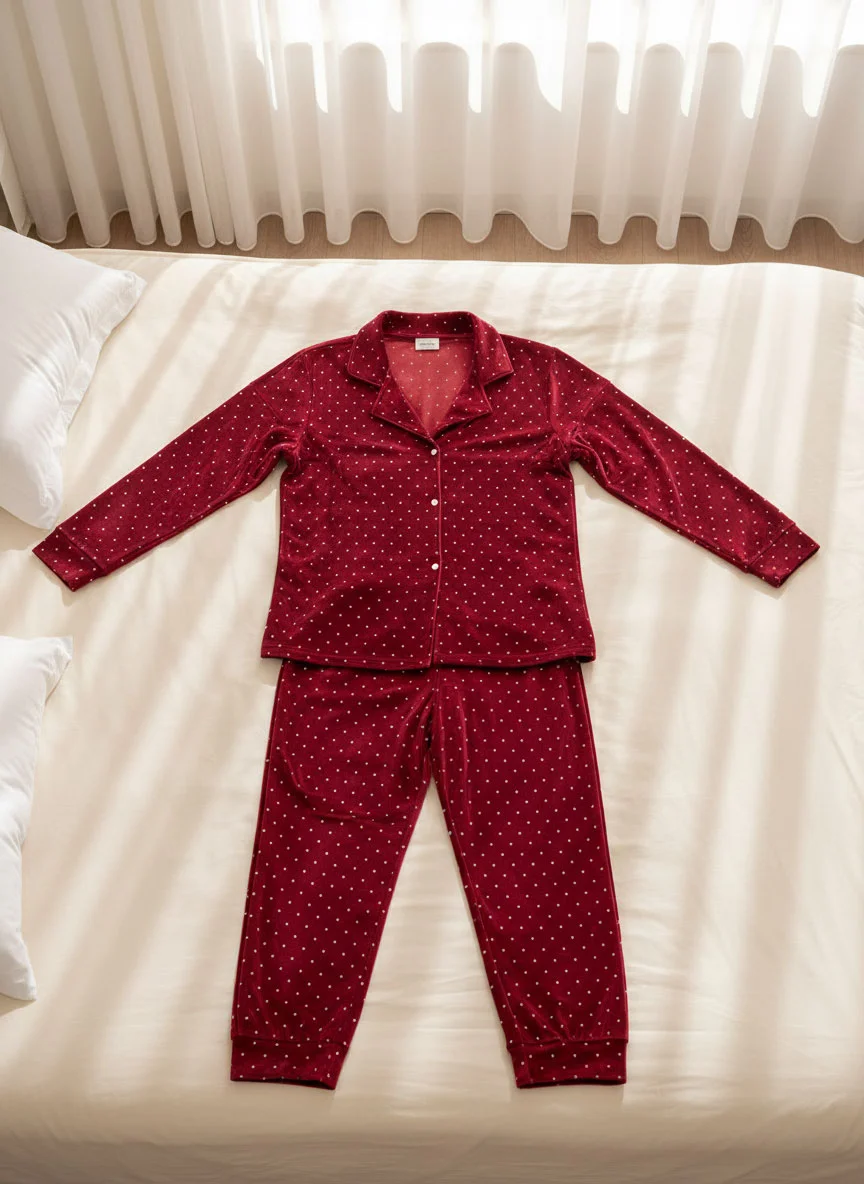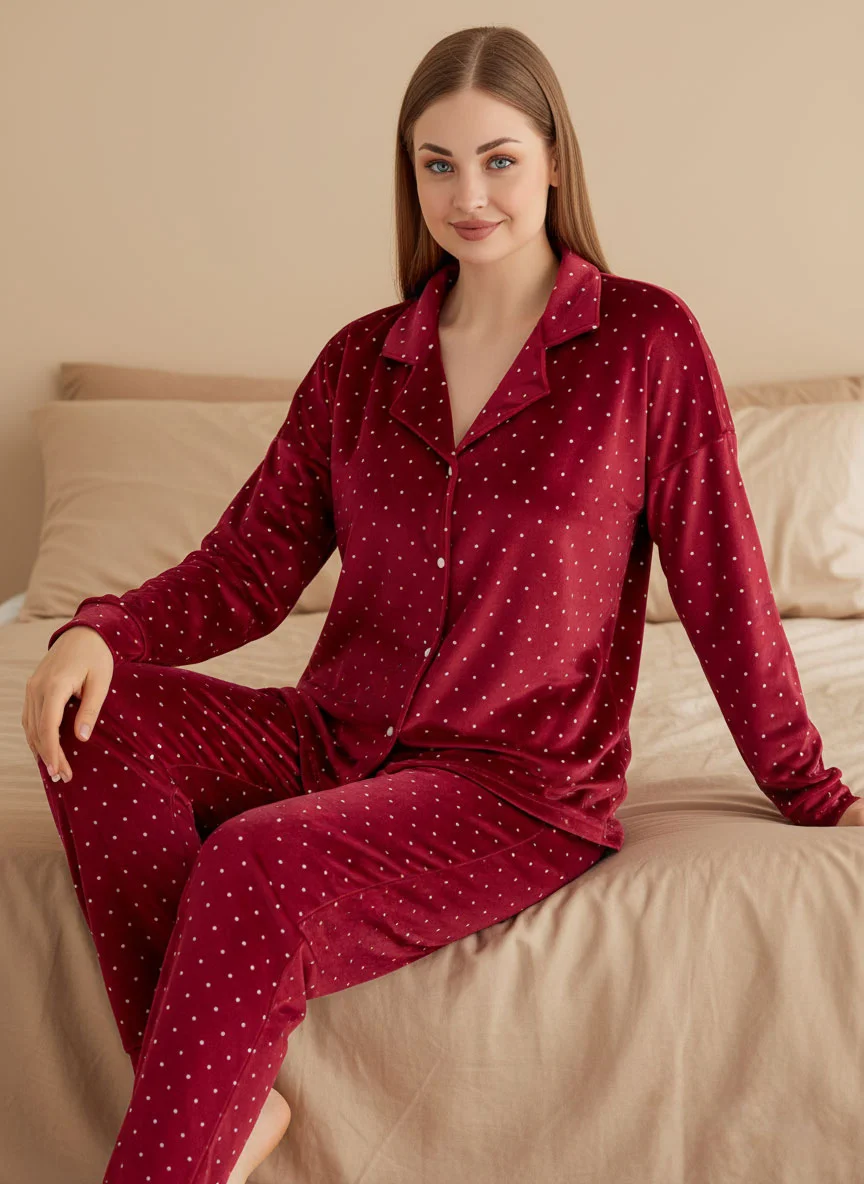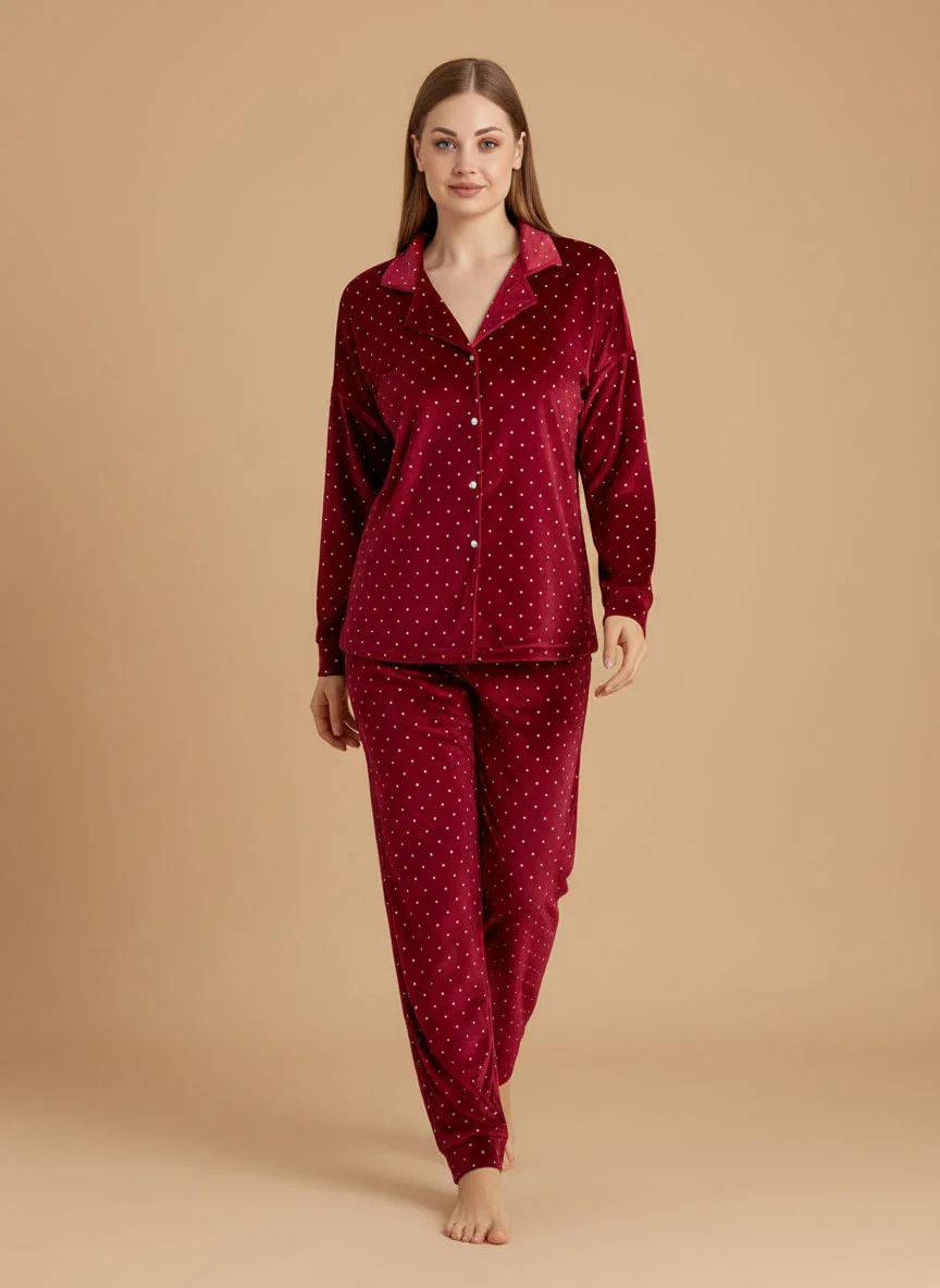 Add charm to your nights with the plush velvet pajama set. Made from soft plush fabric with medium polka dots, this 2-piece design is perfect for cozy winter evenings and relaxed lounging.