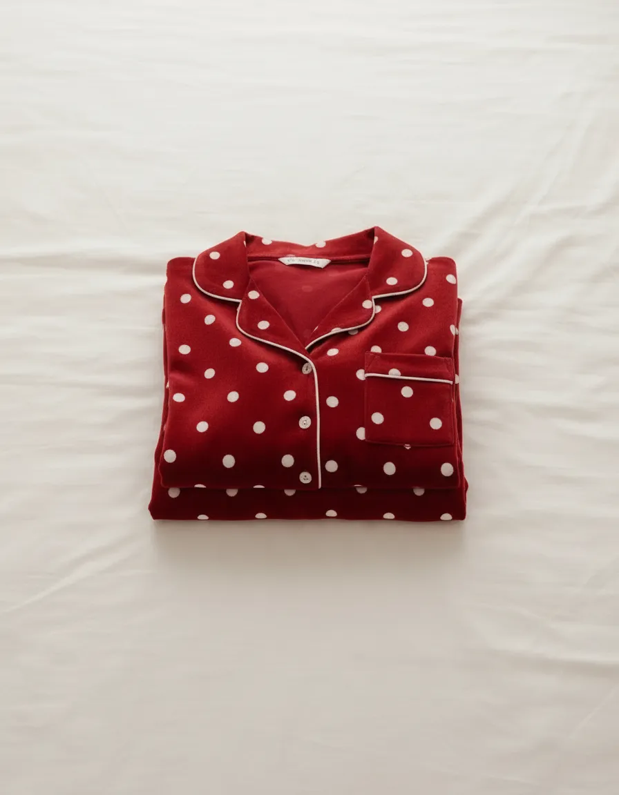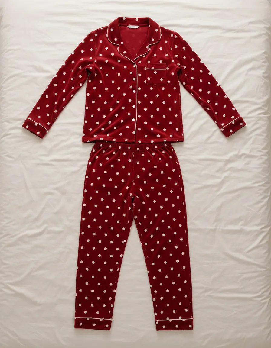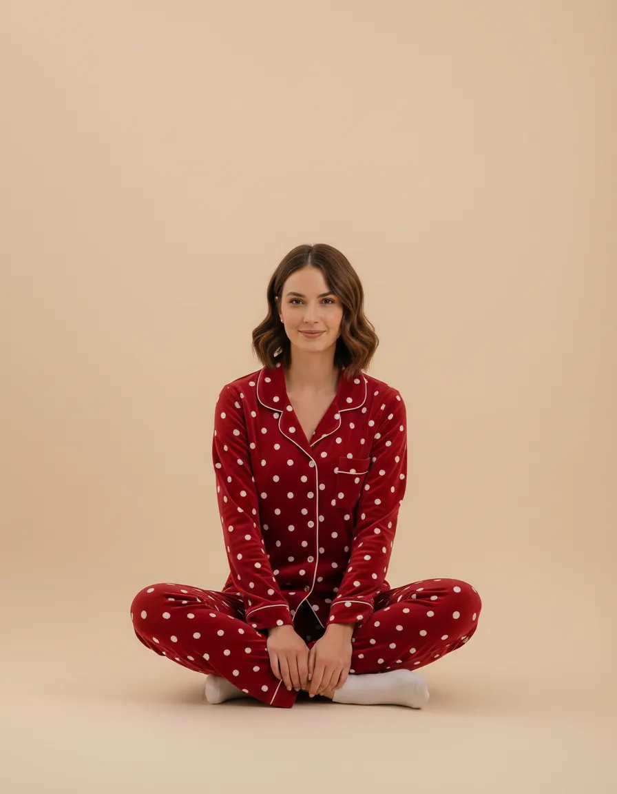 Add charm to your nights with the plush velvet pajama set. Made from soft plush fabric with medium polka dots, this 2-piece design is perfect for cozy winter evenings and relaxed lounging.