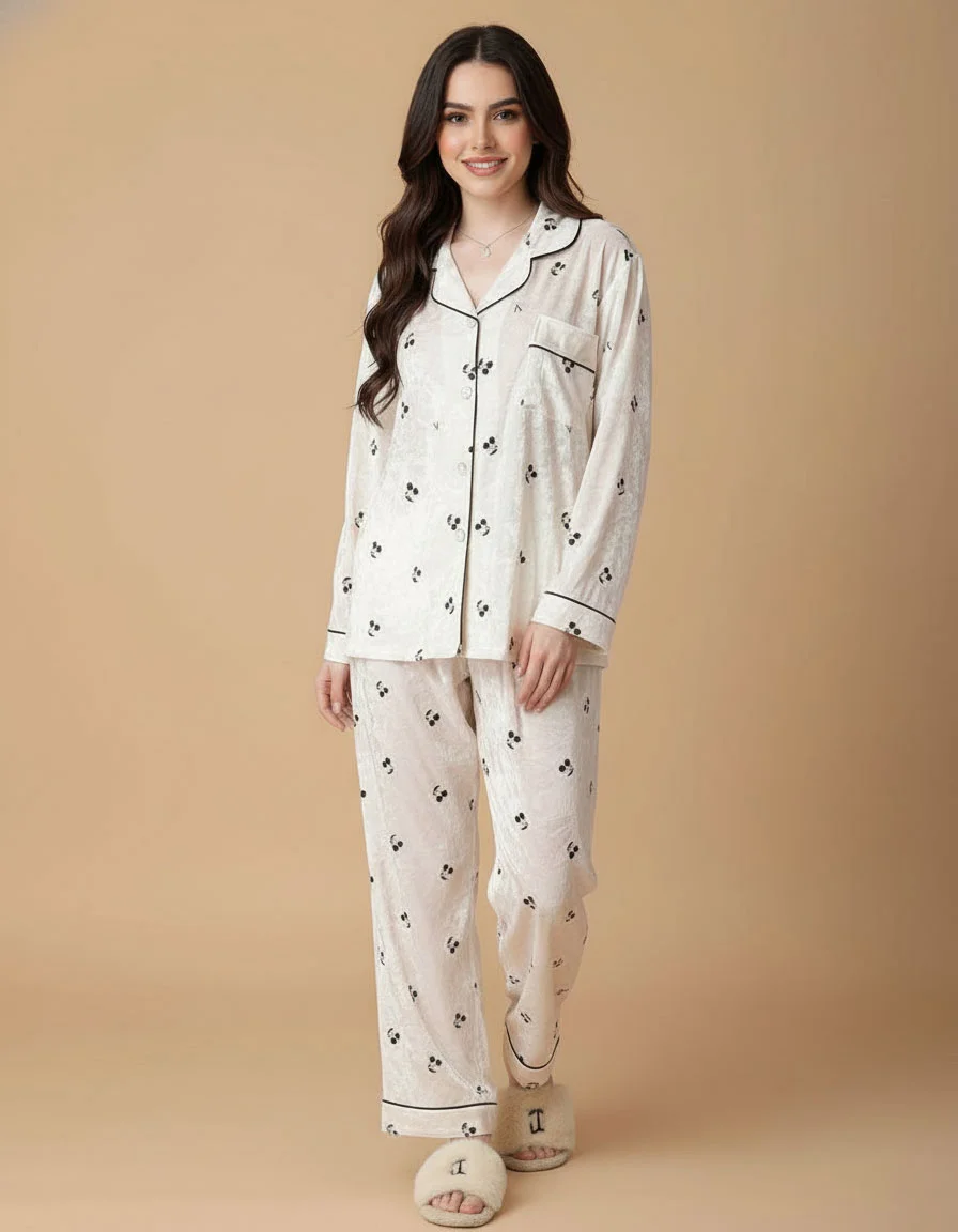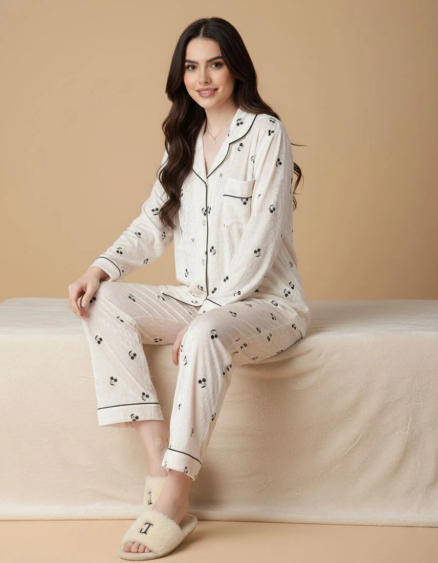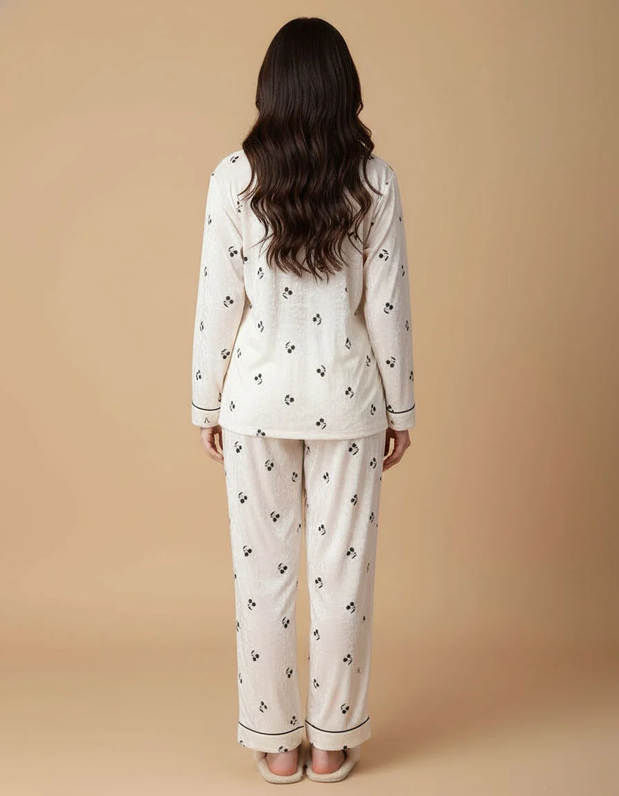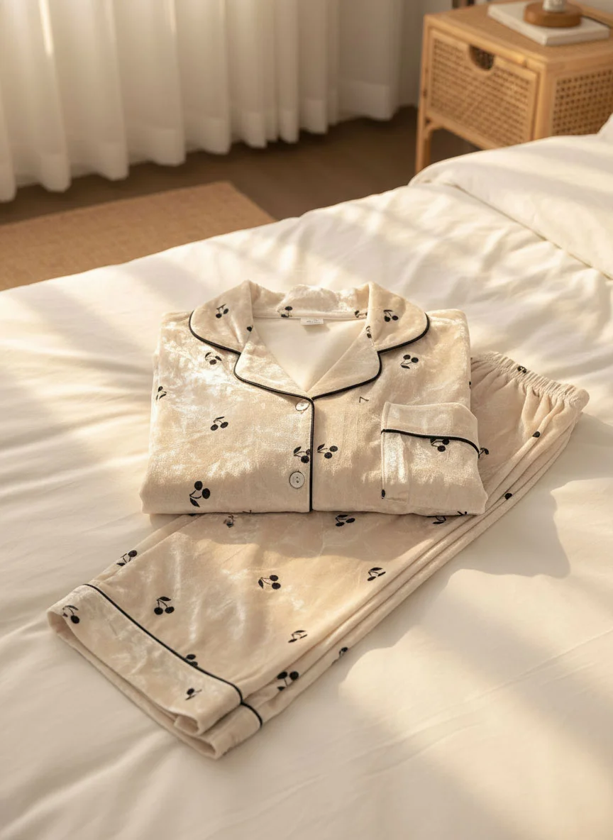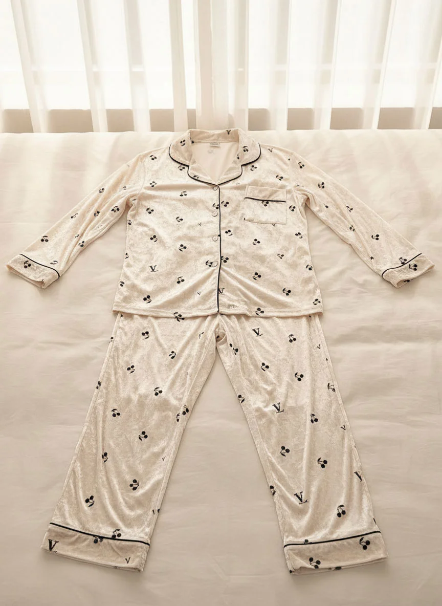 Relax in soft elegance with the soft velvet pajama set. Crafted from French velvet, this 2-piece design features delicate cherry details for cozy winter nights and a feminine, timeless look.